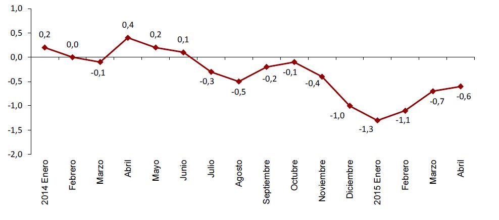 El dato del IPC adelantado de abril de 2015 supone una leve mejora frente al IPC del mes anterior pero acumula diez meses consecutivos de caídas y lo sitúan en el -0,6%.